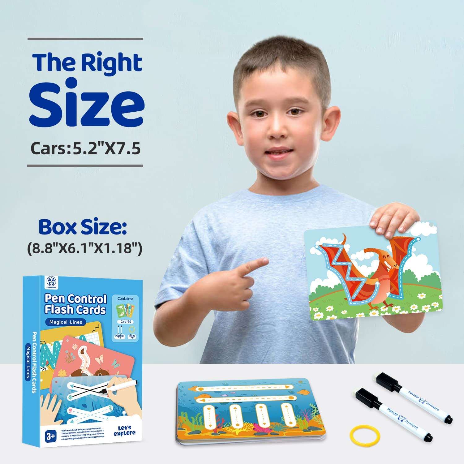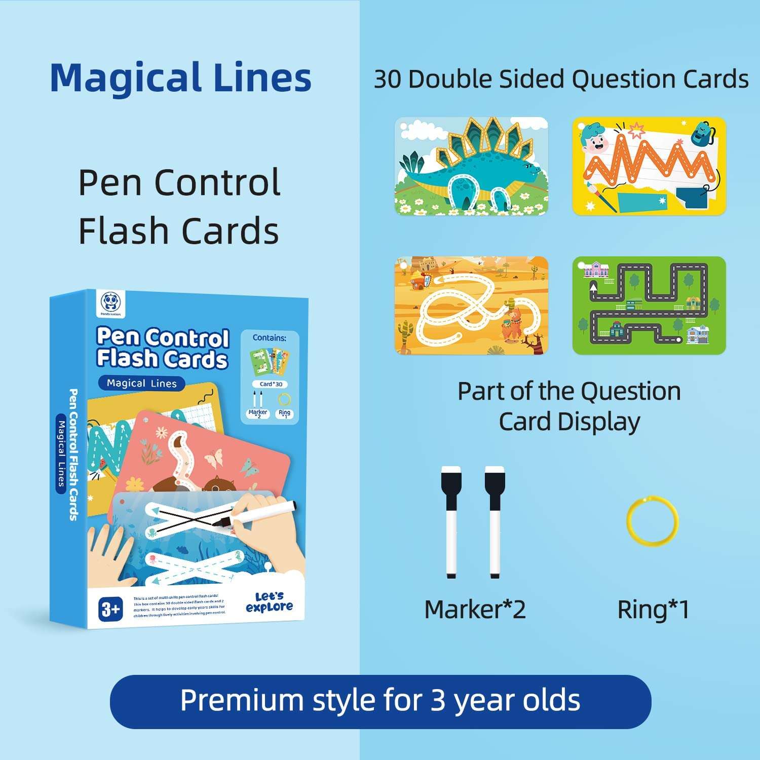Pen Control Flash Cards is a fun set First Learn to Write & Practise flashcards with different step-by-step for kids. It progressively builds confidence in tracing starting with Step 1 : Lines, Curves and Shapes (Magic Lines) Step 2 : Writing Letters, Numbers (Numbers & Letters) Step 3 : Maze Game, Little Artist Step 4: Brain Games, Dot to Dot With 6 sets of practice, your child will develop the motor control for tracing while also learning to recognize shapes, letters and numbers and so on.